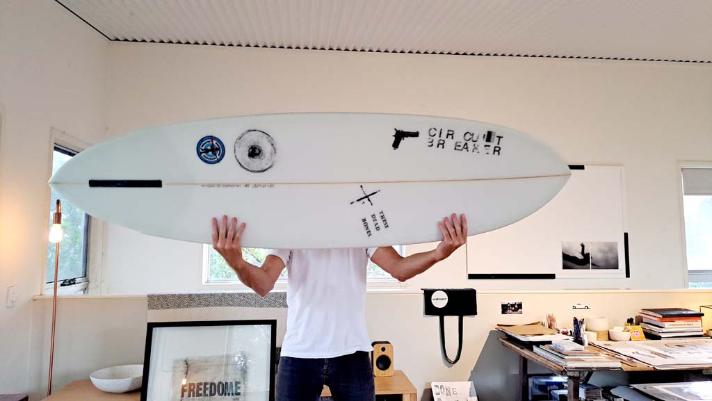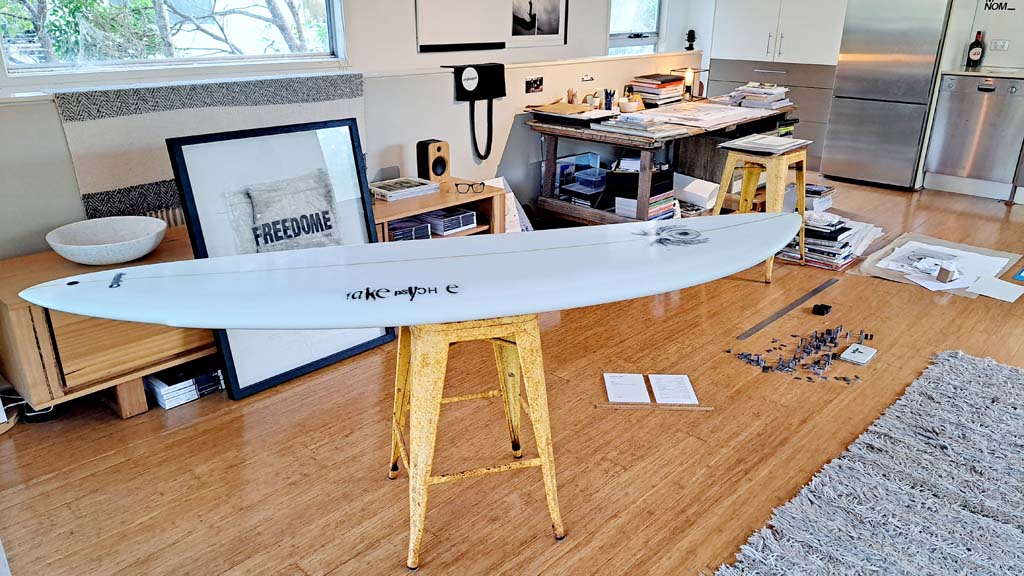 On this one – because it was going to become part of an art exhibition – I pretty much plastered it with text and imagery the was either part of the exhibition or aligned it really well. The decals I created all had the same aesthetic and feel. However there was one part of this that I didn’t think of. Having heaps of individual decals all with a specific location on the foam kinda makes it a bit more difficult to glass. And I remember Harvs saying to me – upon seeing my final decal layout – delivered with that classic Aussie larrikin style deadpan humour, “Oh the glassers are going to love you”.