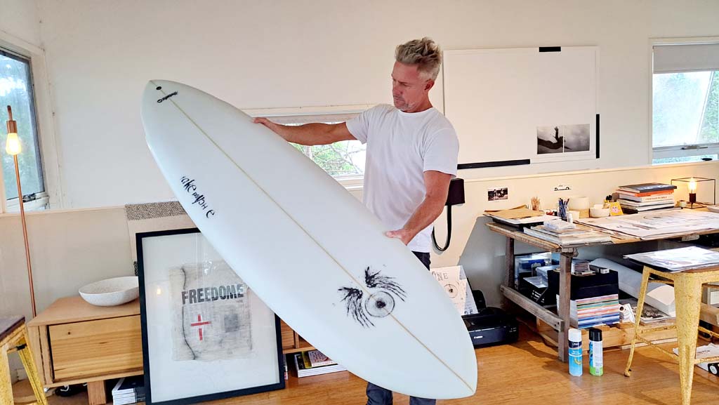 I didn’t go in with the purpose of including the finished board I was shaping in my art exhibition. The idea came to mind nearing the end of shaping. The finished board itself would have been good enough as an art piece. Highly aligned to the learning focus of the exhibition too. But I had been tinkering around for months thinking and writing and creating art and it occurred to me that a lot of it would work well as unique surfboard graphics.